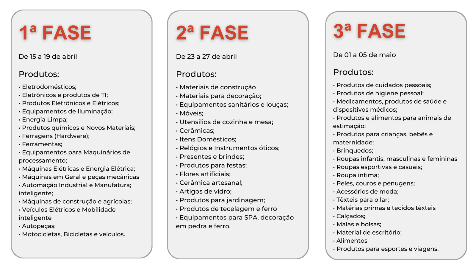 A Canton Fair é dividida em três fases, cada uma com foco em diferentes categorias de produtos: